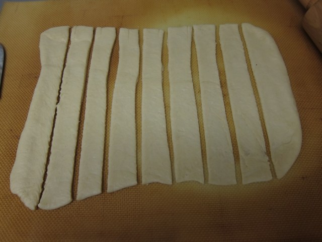 Punch down the risen dough and divide into two pieces. Roll each ball into an 8×11″ square, then cut each into 9 strips.