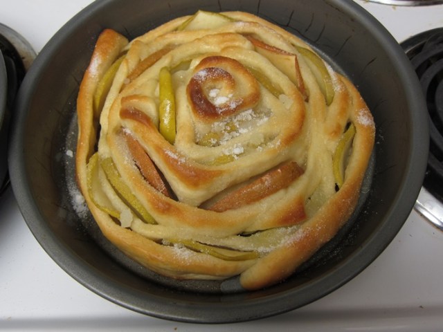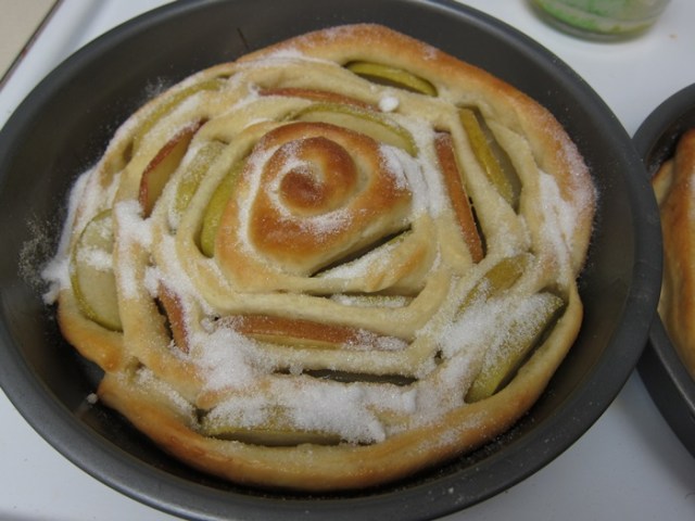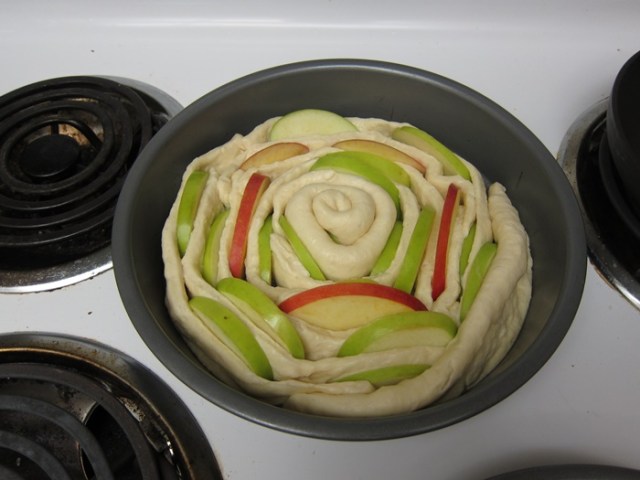 Beginning in the center of the pan, coil the dough strips around apple slices in a spiral, working your way out, and pinching the dough firmly to hold each piece in place. Don’t worry too much about drying off your apple slices, just shaking them off over the bowl is fine. Form a spiral in each pan, using half the dough and half the apples for each. Gently cover with plastic wrap and let rise for 45 minutes. Towards the end of that time, preheat your oven to 375.