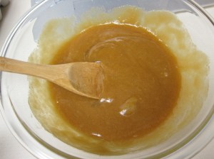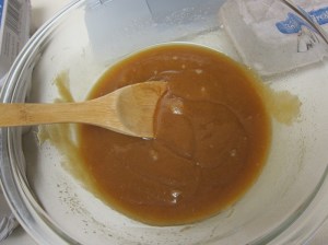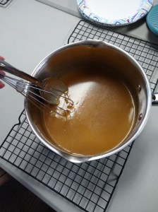 Once the butter is completely melted into the melted sugar, very slowly drizzle in the cream while stirring, being careful of the continuing bubbling.