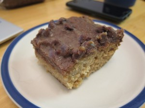 I was sitting around last week about to make one buttermilk dessert, when I decided I didn’t like the idea, prompting a quick scramble around the internet for a new way to use up the pint I had of the stuff. This one required no extra trip to the store (given I made a few alterations to the topping) and came out really, really pleasingly tasty. I think I want this brown sugar topping on EVERYTHING now? It caramelizes a bit, plus has melty sugar, on top of the slightly tangy very moist cake… what a combo! This is a keeper for very definite.