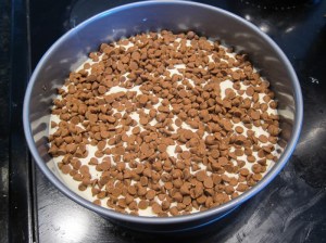 Pour half of the filling evenly into the crust, then sprinkle the 1 1/3 cups of cinnamon chips over the filling.