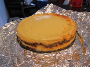 When the cake has cooled the full hour, combine the remaining cinnamon chips and the shortening in a small bowl and microwave in short bursts until the chips can be stirred smooth – they don’t actually have to feel hot to melt, but did require longer than the 30 seconds at 50% power that Hershey’s recommended. Drizzle the melted topping over the cheesecake, then cover and refrigerate at least 4 hours before slicing and serving.