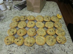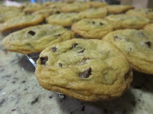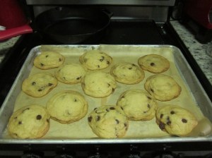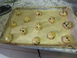 Stir in the chocolate chips, then scoop the dough by heaping tablespoons onto the lined sheets, spacing widely.
