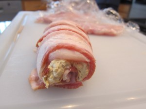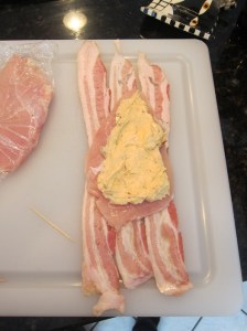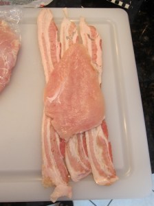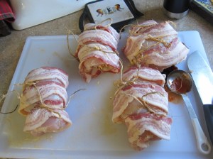 Roll up the meats, starting and ending with the loose bacon. Tie the roll shut with 2-3 pieces of kitchen twine, then repeat with the remaining bacon and chicken.