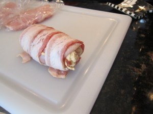 Next, pound the chicken breasts flat. Either put them in a large ziplock or wrap in saran wrap and hit with a meat tenderizer(/can of beans/anything else solid you can hit with) until the chicken has been thinned to under 1/2″ thick. The second time I made this the pieces of chicken were so unreasonably large that I wasn’t able to get the chicken thin enough, which made it a nightmare to roll, so oversized chicken isn’t a plus in this case.