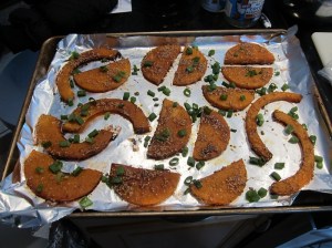 Combine the sesame seeds, oil, gochujang, and soy sauce in a large bowl or ziplock. Add the sliced squash and stir/shake to coat. Lay the squash out, in a single layer, on the lined sheet. Bake, rotating half-way through, 25-30 minutes until browned. Sprinkle with scallions and salt, and serve.