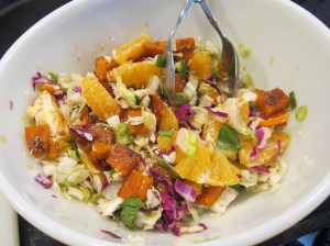 If desired, cut the squash into bite sized pieces and stir, along with the orange pieces, into the salad mix, using the dressing that comes with the salad.