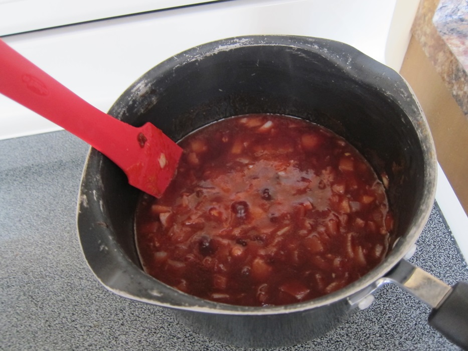 While the crust cools, first prepare the jam. Stir together the chopped pears, orange juice, and sugar in a medium saucepan over medium-high heat.