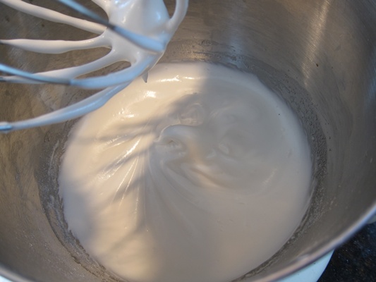 Beat the egg whites and vanilla until frothy, then add the sugar mixture, one tablespoon at a time, and continue beating until the mixture reaches soft peaks. Add the cornstarch mixture, 1 tablespoon at a time, and continue beating until the mixture reaches stiff peaks.