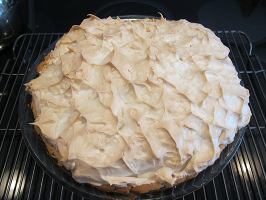 I really like recipes from my Cook’s Illustrated book, because you know they tried tons of different methods to get the best results. In this pie, for instance, they tried a bunch of things to prevent common problems with meringue. The solution they came up with includes having you put the meringue on hot filling to help cook the bottom of the meringue (which prevents puddles of uncooked/undercooked egg), and bake in a relatively cool oven to prevent overcooking and brown the meringue evenly. It works wonderfully!
