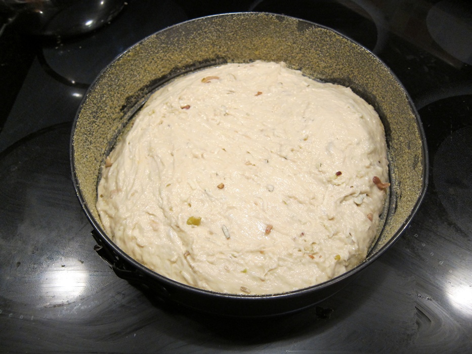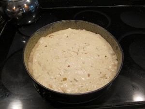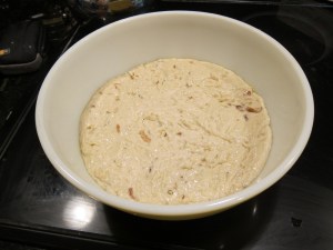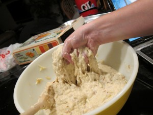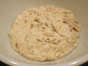 When the rice is ready, stir it into the bacon mixture. The heat from the rice should melt the cheese, providing a bit of extra stick to hold your cakes together. While you are stirring the rice into the bacon mixture, pour on the soy sauce and keep stirring. I found one tablespoon to be plenty, but taste as you go and see what you like. Press the mixture into an 8X8″ pan, pressing down very firmly to compact everything together.