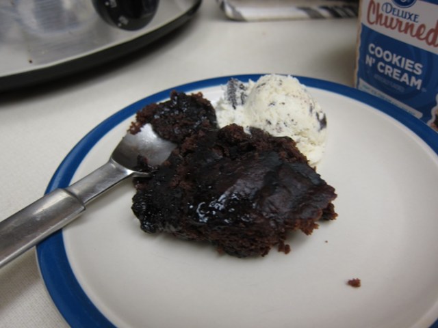 Gently pour over the cake batter, so it doesn’t mix in. Cover the crockpot and cook on high until the top is set, 2 – 2 1/2 hours. Turn off the heat and let stand, covered, for 30 minutes, then serve with some vanilla ice cream. The ‘pudding’ made by just the cocoa powder, sugar, and water is surprisingly delicious as a topping!