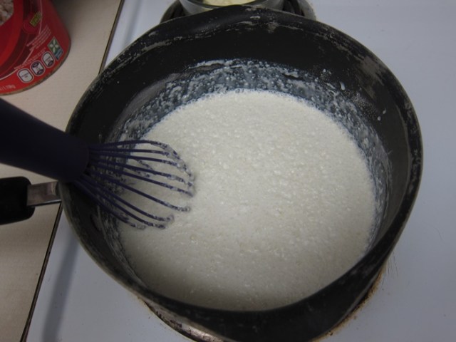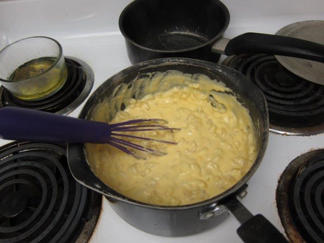 Bring to a boil. Remove from the heat and stir in the cheese, pepper, mustard powder (if desired), and salt. Stir every few minutes until the cheese is fully melted in.