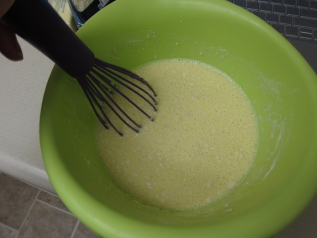 Meanwhile, in a large bowl whisk together the eggs, milk, flour, and cayenne, then stir in the cheese.