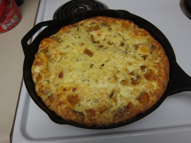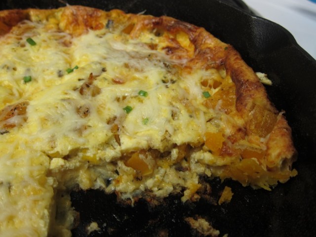 When the squash is cooked, turn it out into a plate/bowl, and put the butter in the still-hot pan, placing back in the oven for a minute if necessary to melt the butter. Turn the pan all around to grease the insides of the pan.