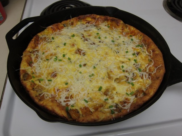 Remove from the oven, sprinkle with some more of the Parm blend and some chives, and let stand 15 minutes before cutting and enjoying!
