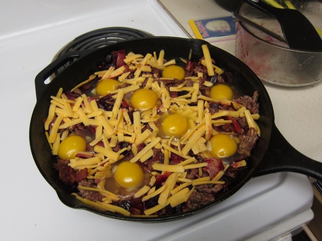 Top with the cheese, then use a spoon to make 8 dents and gently break an egg into each, being careful not to break the yolks.
