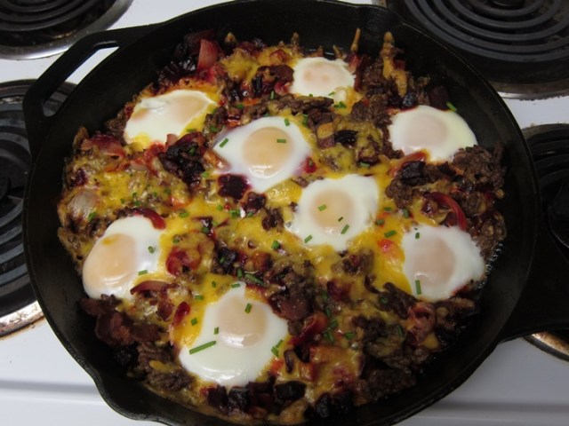 Meanwhile, in a cast iron skillet over medium heat, cook the bacon until crispy, then remove to drain on paper towel. Cook the ground beef, breaking it up, until it’s fully browned through, then remove the pan from the heat and pour off any excess grease. Season with salt and pepper.