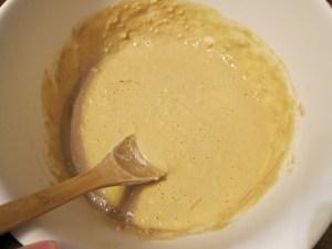 Heat the milk to a boil on the stove. You can start this while you combine the egg/sugar/flour/cocoa mess, just be sure not to start so early that the milk starts to burn. When the milk has reached a boil, drizzle it over the cocoa mixture, whisking as you do so that the eggs in it don’t cook. Because the cocoa mixture is so thick, I had to add a bit of milk at a time, whisking after each addition, until the mixture was thinned enough to not just clump up in the whisk immediately. Keep whisking until it’s a smooth liquidy mixture.