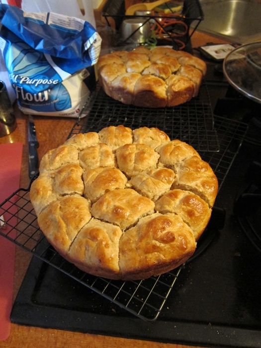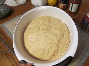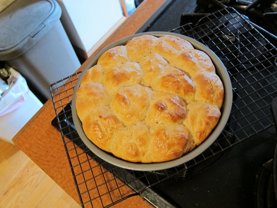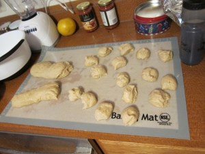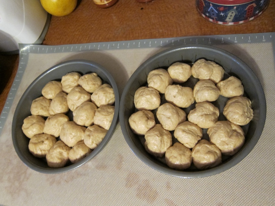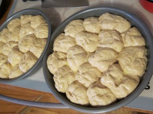 Roll out a third time, making a roughly 14X8″ rectangle. Roll the dough up lengthwise, to make a long roll. Cut into 12 even pieces. Put the pieces into a well greased muffin tin, cover with plastic wrap, and set aside to rise 30-45 minutes.