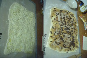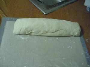 It’s then time to assemble the rolls! Start out by greasing a 9X13″ dish. Turn your risen dough out again onto a lightly floured surface and pat/roll it out to a 10X15″ rectangle. The dough will still be thick.